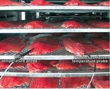 傳統的方法是將凍肉放在水槽中解凍,與之不同的是,蒸汽解凍法是將凍肉放在多層的可移動架子上,然后吹入蒸汽,使凍肉溫度升高到設定值。蒸汽的高濕度保證了熱力的均勻散布,而風扇更是保證了所有產品在橫向和縱向都能充分接觸蒸汽。同時,凍肉表面的溫度傳感器和插入內部的溫度傳感器可實時監測產品的溫度范圍,保證溫度的均衡性,因此避免了產品的過熱和細菌的繁殖。