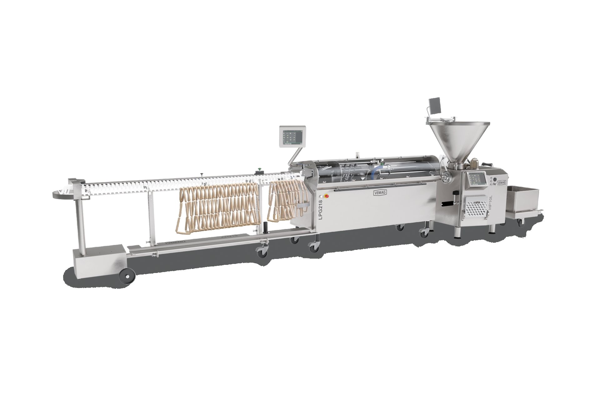 對(duì)于需要進(jìn)一步熏制或發(fā)酵的香腸,威邁格的自動(dòng)掛桿裝置可直接將扭結(jié)好的香腸整齊排列至掛桿上,替代大量人工操作。不僅提升工作效率,還確保產(chǎn)品在后續(xù)工序中受熱或發(fā)酵的均勻性,從而顯著提升整體品質(zhì)。